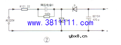 拆机检查,发现电源板上的电源芯片PN8024A(IC101 )烧坏,L101烧断。实绘该机电路如图1所示,220V交流电压先经R101限流、D101半波整流,再经EC101、L101、EC102滤波后,送到IC101⑤~⑧脚,IC101①脚输出的开关脉冲经D103整流、EC104滤波后,得到12V电压。 本机控制芯片安装在电源板上,通过排线CN101的②脚(TXD,数据发送)和③脚( RXD,数据接收)与面板进行通信,电源板12V电压通过CN101的⑥.⑦脚送往面板,经面板上的5V稳压器稳压后,再从⑤脚回送给电源板[ IC202(7805 )和R203安装在面板上],供应控制芯片和温度传感器。D121~D124是保护控制芯片引脚的钳位二极管。Q181是一只PNP型三极管,和外围元件组成交流电压过零检测电路,过零信号送往面板及控制芯片10脚。加热盘控制继电器是否吸合由Q111.Q114和Q115控制,只有控制芯片的⑤、⑥脚同时呈高电平时,继电器才吸合,以防止Q111击穿后发热盘一直加热的现象出现。ZD111 和D111是吸收元件,以避免控制三极管被继电器截止时产生的电动势击穿。另外,上述三极管都是带阻三极管,检测时不要误判。 提示:PN8024A可用VIPer12 或VIPer22直接代换,由于PN8024A 内部自带稳压取样电路,而VIPer12或VIPer22内部没有此电路,代换时需外接一个取样电路,最简单的方法是在芯片的③、④脚之间加装一只12V的稳压管(+极接③脚,一极接④脚),否则输出电压会高于30V。 须注意的是, 本机控制电路和市电没有隔离。由于手头没有PN8024A芯片,因此决定用简单的电容降压电路来代替(如果控制电路和市电隔离,即控制电路为冷地,就不能用电容降压电路)。 电容降压电路如图2所示,降压电容C的容量大小要和负载电流相匹配,1μF电容在半波整流时约能提供30mA电流,在桥式整流时约能提供60mA电流。另外12V稳压管的功率也要和降压电容的容量相匹配,因为在完全空载时,流过电容的电流将全部通过该稳压管。如果单只12V稳压管功耗不够,可以用多只低电压稳压管串联组成。在本机中,由于AC220V的一端直接接12V的正端,所以只能采用半波整流,不能采用桥式整流,否则将影响交流电源过零检测电路的工作。 如果不清楚负载电流情况,可以先用1μF电容试机,本机是用继电器来控制加热盘,其功耗较大(如用双向可控硅控制,则功耗较小),采用1μF电容空载时,12V电压正常,但继电器线圈通电时电压跌至7V ,继电器无法吸合;试用2μF电容,在继电器工作时输出电压维持在11V,基本正常。