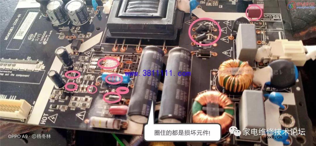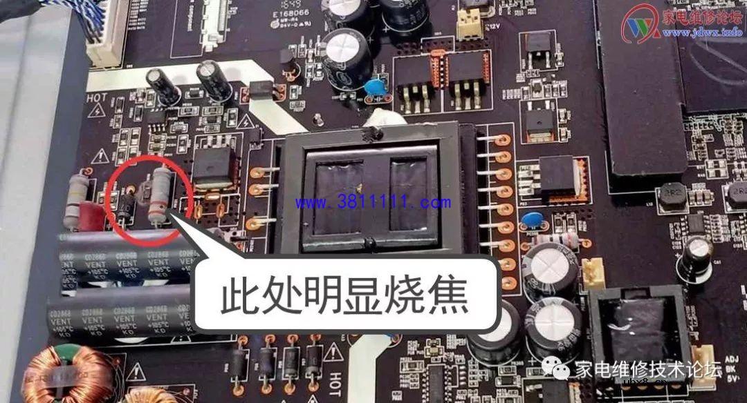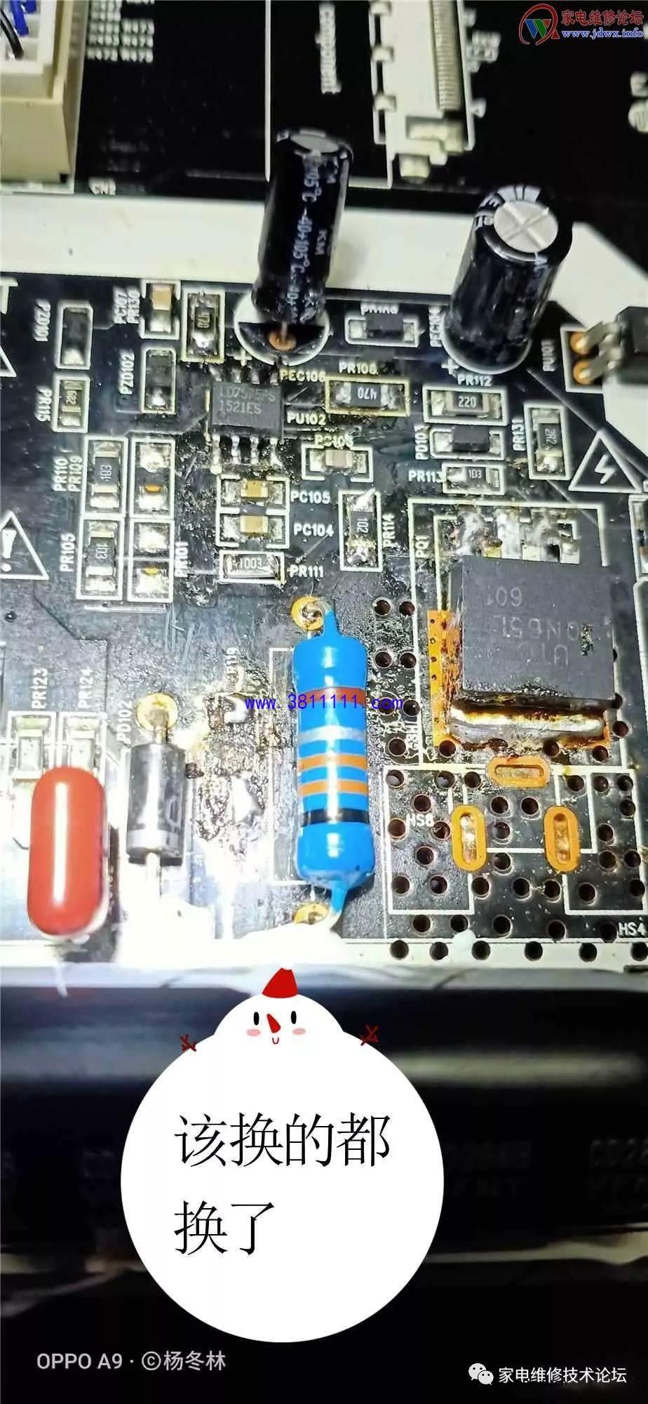 先测烧伤处的并联限流电阻PR121, PR119 (0.33欧+?),一大一小电阻早已见上帝了!小的看不清,不知多大阻值,干脆不装算了。并装在一块的那个防尖峰的二极管也连带遭殃击穿了!电源管PQ207 :70R380P也短路了,用10N65贴片代替。再理电源管的G极线路,发现PR106 470也烧断了!这PR106与OB5269的5脚(PWM脉冲驱动输出)相连,说明电源芯片OB5269也损坏了!因手边没有OB5269换,只好用LD7575来代替。代换时,在芯片1脚处加装一只100K电阻与地相连就行。线路板上正好有个PR111空着的位置,填上就可以了。 检修到这里,感觉要换的基本换了,要测的也测了,就是还没上电试机,心里有点忐忑不安了,生怕漏掉了损坏的元件没查出来而存隐患!只好鼓起勇气插电试机了,突见电源指示灯红灯亮起!测LD7575的6脚,有12V左右供电电压出现!再按待机键,只见屏幕背光亮起!谢谢欣赏,下次再会!