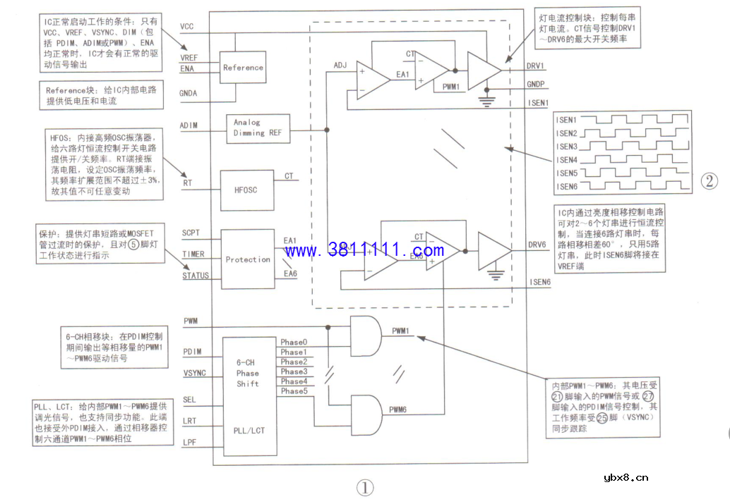 背光亮度控制芯片0Z9906GN工作原理与维修(上) 一 0Z9906GN芯片特点 0z9906GN有28 个引脚,最多可对6路LED灯串电流进行驱动与检测,具有展频、外加PWM亮度控制、MOSFET管过流保护、LED灯短路保护、灯保护阈值可外定、LED故障指示等功能,主要用作大屏幕LED背光电路中,其引脚功能见表1,内部框图如图1所示。