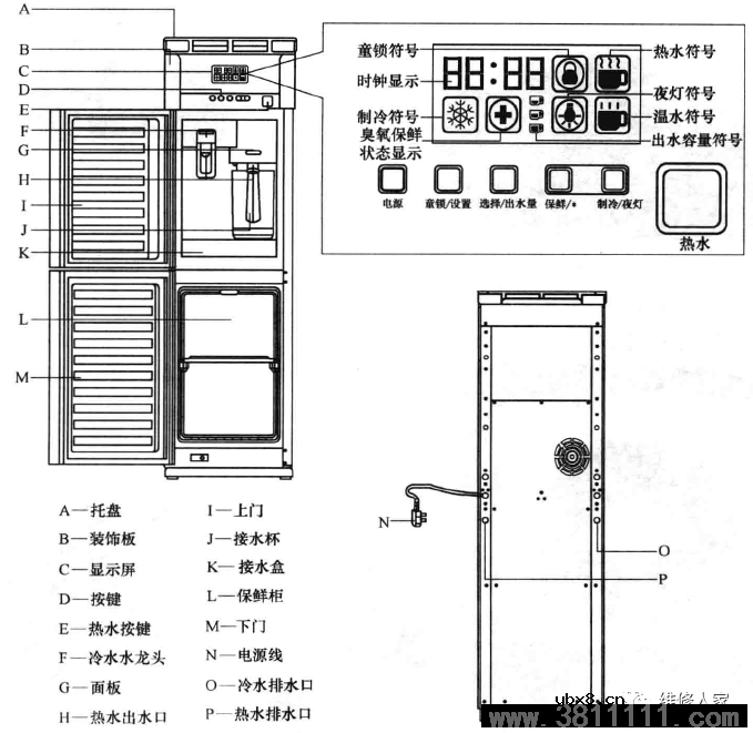 —、饮水机的组成(1)饮水机外部组成如下图所示,饮水机外部主要由显示屏、按键、热水按键、冷水水龙头、面板、热水出水口、上门、接水杯、接水盒、保鲜柜、下门、电源线、冷水排水口、热水排水口等组成。(2)饮水