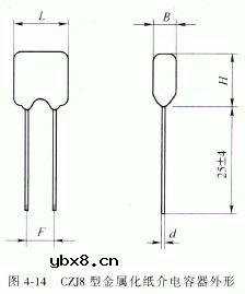 CZJ8型金属化纸介电容器 CZJ8型金属化纸介电容器适用于小型电子仪器、通信设备及各种电子设备的直流或脉冲电路中。其外形如图4-14 所示,主要特性参数见表4-20 和表4-21 。