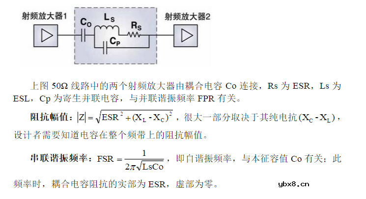 耦合与隔直电容串联在电路中,耦合电容选择适当能将保证射频能量得到最大限度的传输。一个实际电容能否满足电路耦合要求,取决于随频率变化的电容相关参数:串联谐振频率FSR、并联谐振频率FPR、纯阻抗、等效串联电