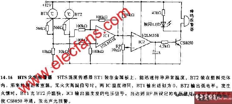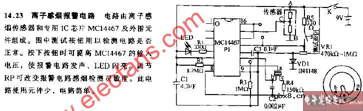此电路是MC145010组成的烟雾报警电路图 它采用9V叠层电池供电。R2、C3分别为振荡电阻与振荡电容,时钟周期由下式确定: