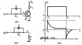 加速电路及其波形 加速电容器C和三极管输入电阻R组成微分电路。在输入信号正跳变时,可提供比无加速电容大得多的正向基极电流,使三极管很快达到饱和,见图。在输入信号下跳时,又可提供很大的反向基极电流,使基区