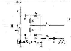 二极管用作平衡型AFC 如图为平衡型AFC电路。BG1为分相管,行同步信号加于其基极,在它的发射极和集电极分别得到幅度相等,相位相反的一对同步脉冲,C1,C2,R1,R2,D2,D1构成平衡鉴相器,并且R1=R2,C2=C2,D1,